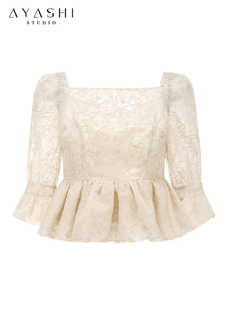 Cream Flocked Puff Sleeve Top