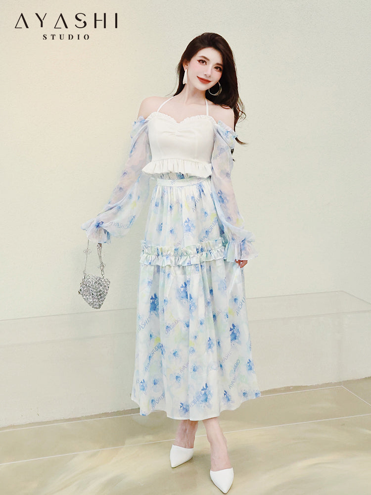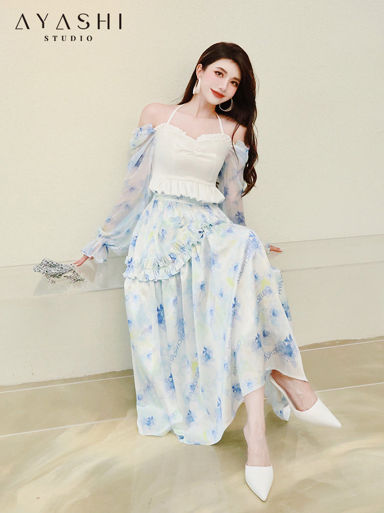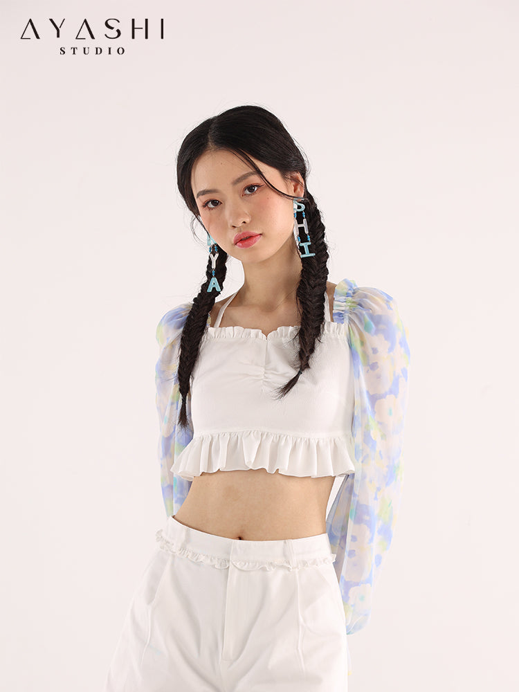 Blue Printed Chiffon Balloon Sleeve Top