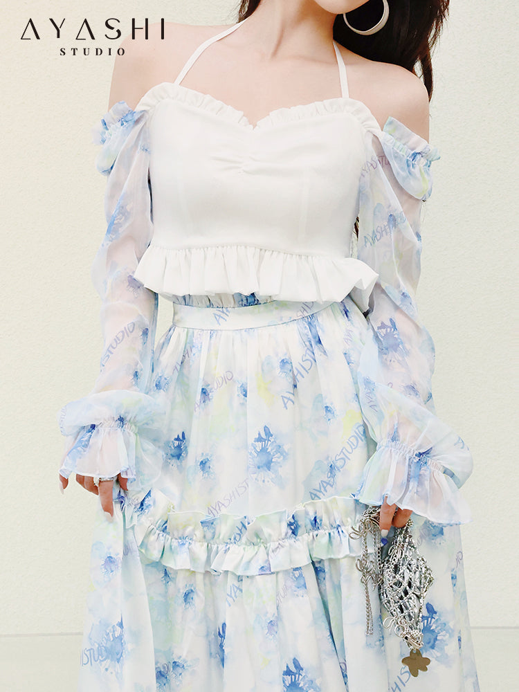 This blue printed top has been modified many times on the sleeve shape, making the arms behind the upper body look more slender and have a fairy atmosphere. The Smak workmanship on the back allows the comfortable fabric to cling to the upper body.