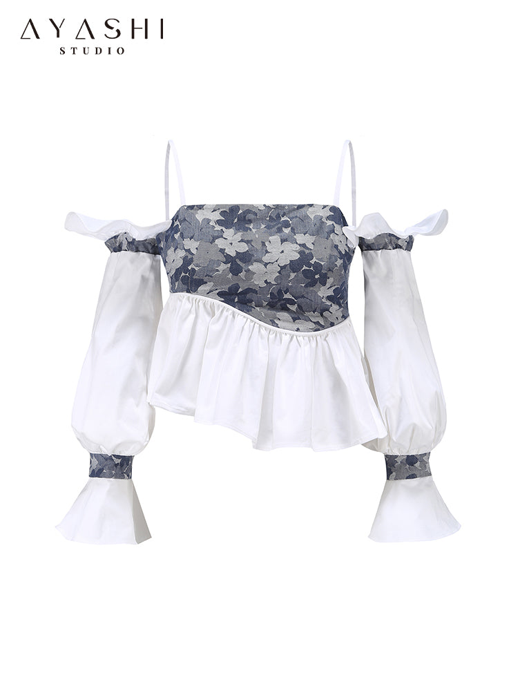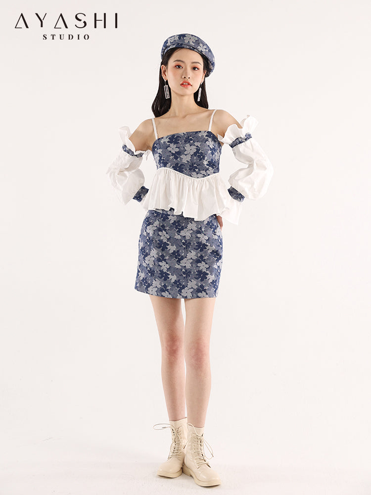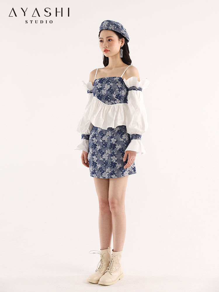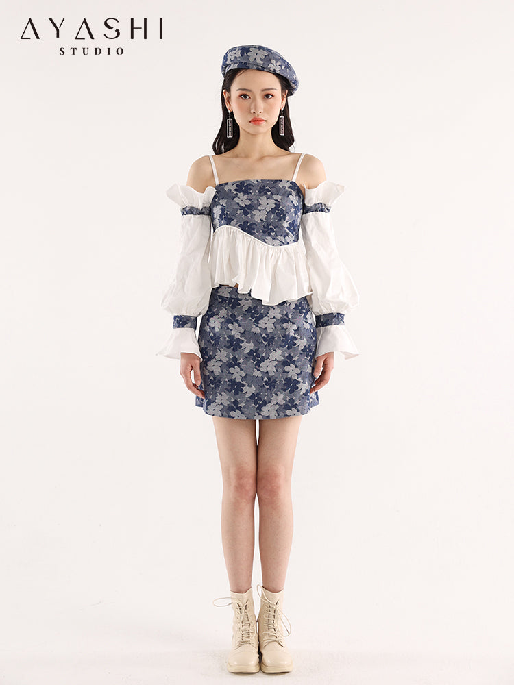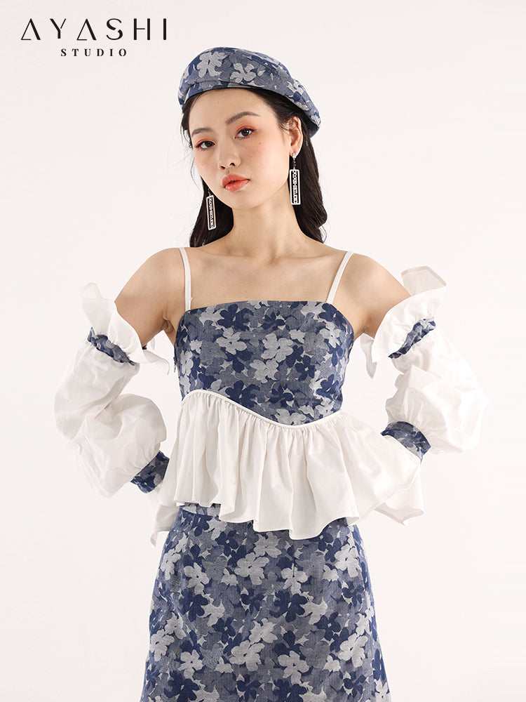 Blue Floral Jacquard Pleated Wave Balloon Sleeve Top